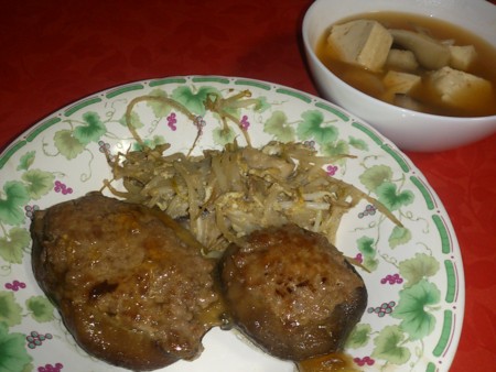 椎茸の肉詰め、椎茸ともやしと卵の炒め物、椎茸と豆腐のキムチスープ