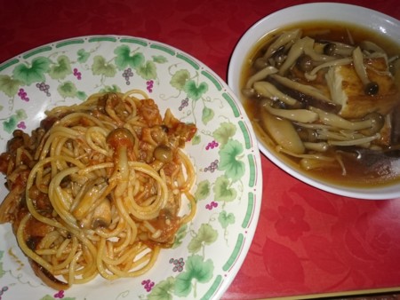 昼にうどん食べたのに夜も麺にしてやったぜ。トマトソースのパスタと厚揚げのきのこ餡掛けというおかしな組合せになってしまった(^^;