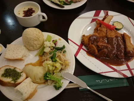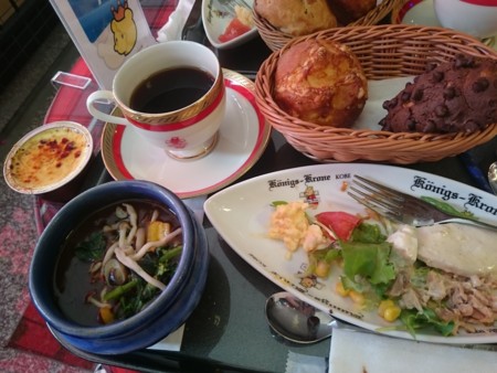 ケーニヒス・クローネホテルのランチに来ました!前にチャレンジした時はランチ終了で食べられなかったけど今日は入れたよ。いいお天気なのでテラス席でいただきます。カップもフォーク、スプーンもお皿もケーニヒス・クローネロゴ入ってます。