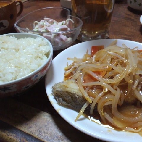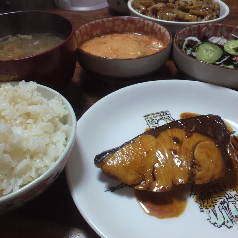 ぶり照りと酢の物と昨日の残りの豚汁。ひじきもあるし、れんこんと豚のオイスター炒め、納豆も…今日もボリュームハンパない(笑)
