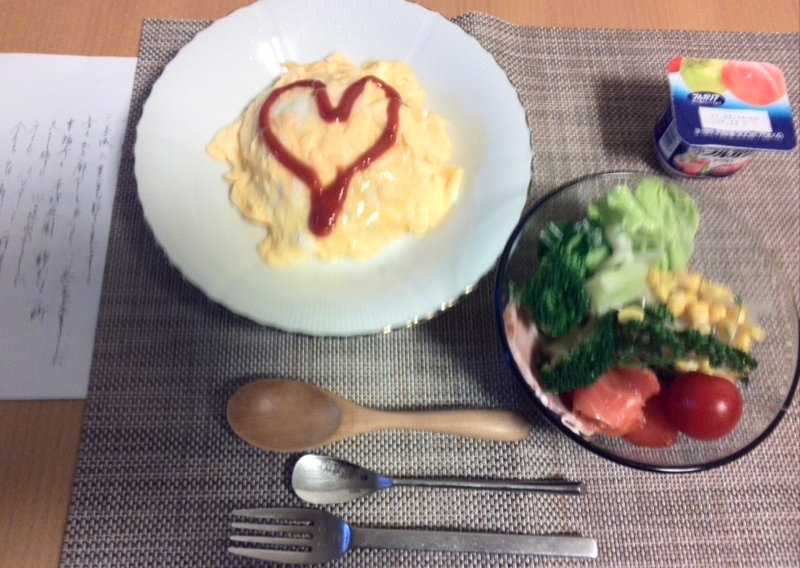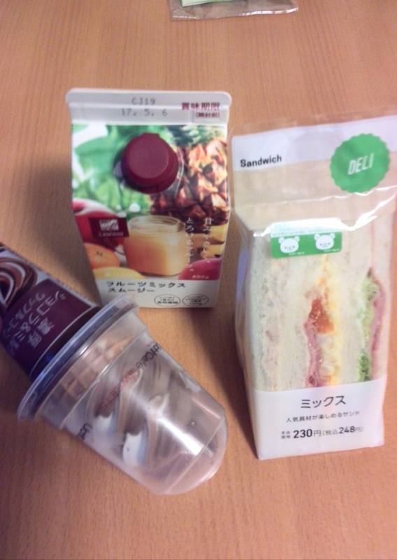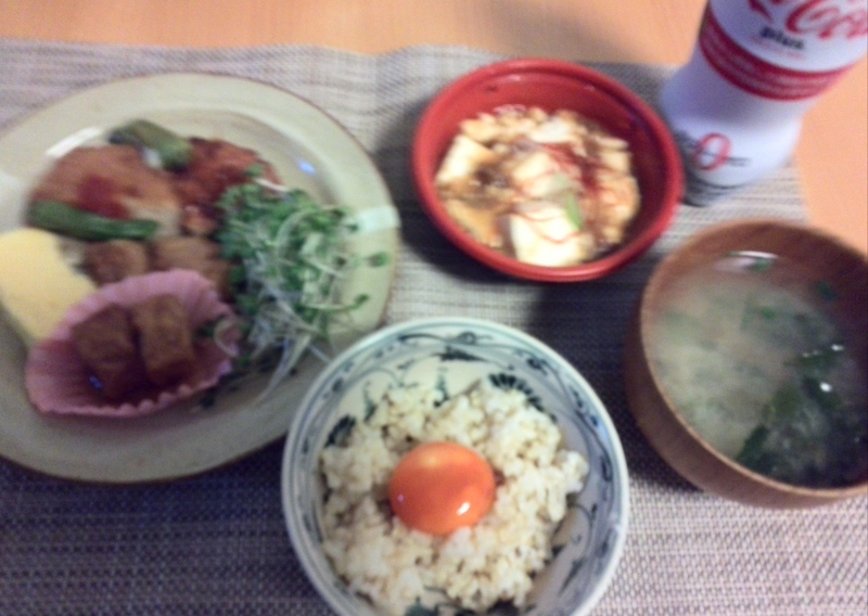 お母さんが揚げ物とコンビニケーキの差し入れを持ってきました。互いに頑固者なので外食以外は生活が別々です。