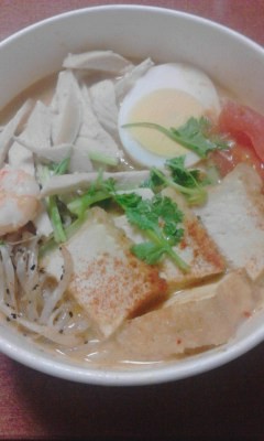 成城石井の「シンガポール風ラクサ」。酸っぱ甘辛いココナッツスープがビーフンにかかっています。