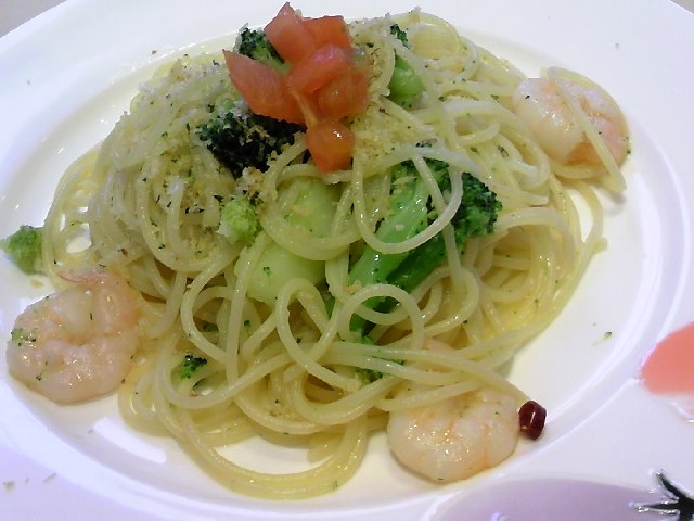 娘と、エビとブロッコリーのペペロンチーノ。