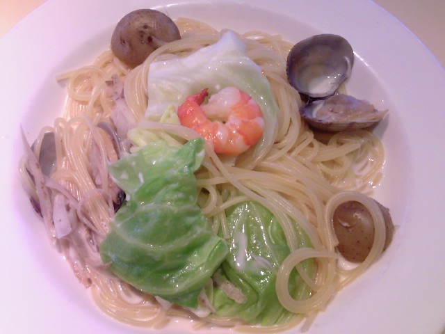 あさり、海老、新じゃが、春きゃべつ、ごぼうのクリームパスタ。