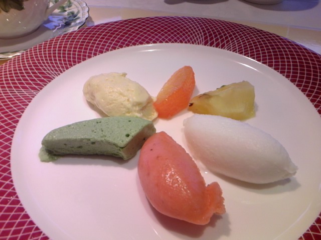 オレンジとパイナップルのシロップ漬け、ヨーグルトといちごのシャーベット、抹茶とパッションフルーツのムースです。