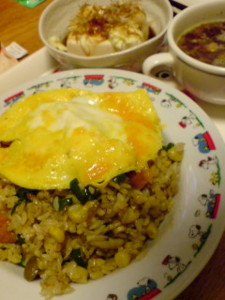 ・さっきのレトロ炒飯の素を使った変わりオムライス(しめじ、ピーマン、コーン、ウインナー)