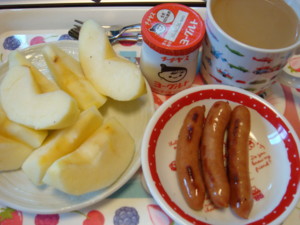 あんまり食欲なかったから、りんご、ウインナー、チチヤスヨーグルト、カフェオレ。