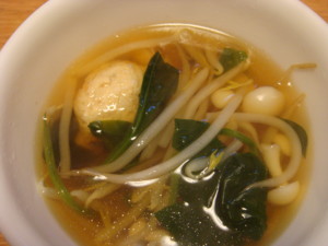 ツナのミネストローネ(ツナ缶、コーン缶、カットトマト、バジル、オレガノ)。