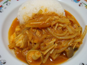 エリンギとかまぼこのスープ。中村屋のカレー。