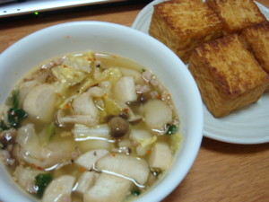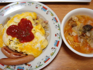 牛肉と野菜のトマトスープパスタ。アスパラガスの卵焼き(しっぱい…)