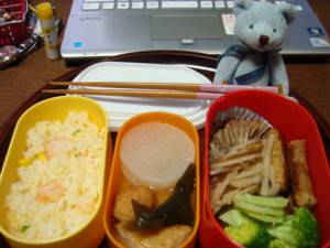 お母さんが作っておいてくれたお弁当形式夜ごはん。昨日の残りのおでん。他。