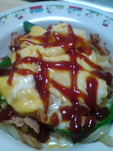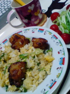 グリーンリーフとたまごの炒飯てりやきチキンのせ。