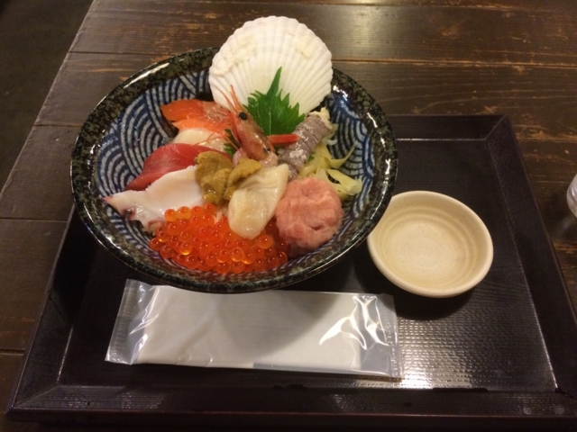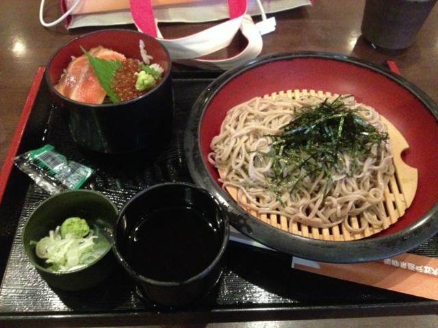 入浴を済ませて早い夕食(昼食抜き)に、そばと石狩丼のセットをいただきます。
