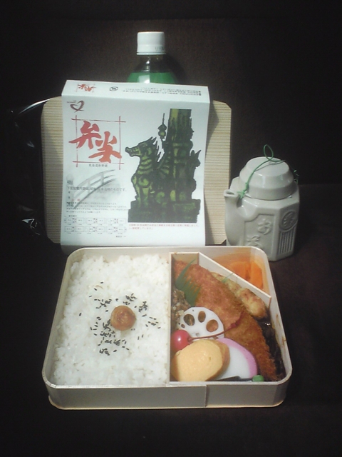 復刻昭和39年新幹線開業弁当と汽車土瓶入り…ではなくて復刻版土瓶(一日20個限定)を横に置いてペットボトルのお茶で昼食です。