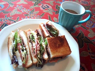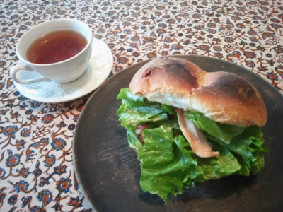 鶏の炙り焼きサンド、トマトとレタスたっぷり。パンは新開地の映画館とこの冷凍してたやつ。美味しいわ、これ。紅茶はいつものレディグレイ。