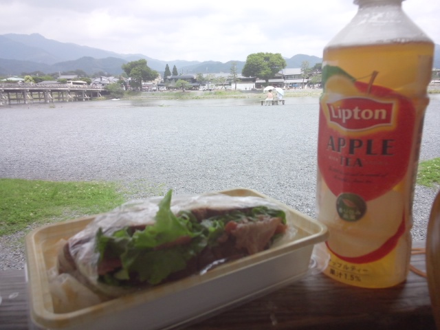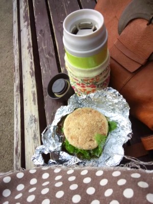 お昼に美容室だったからその足でお散歩をして公園でいただきました。カレーの残りと葉物を挟んだイングリッシュマフィン、カフェオレ。