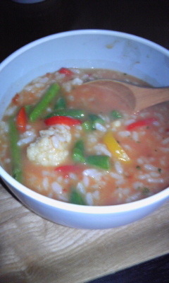 お風呂も入ってパジャマに着替えて、豆乳で作ったポトフもどきをいただきます。