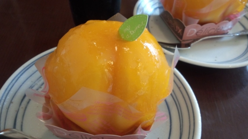 桃の芯をくり抜いてカスタードクリームを入れ、マンゴーソース。