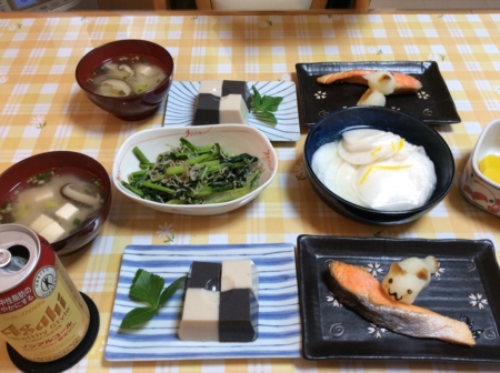 焼き鮭と蕪の葉ちりめんじゃこのおひたし、