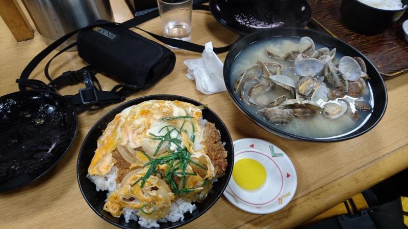 カツ丼はノーマルサイズだが特盛貝汁と比べると小さいな