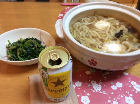 法蓮草のおひたしと昨日の鍋の出汁でうどんを煮ました。