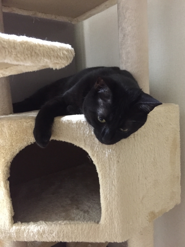 長いしっぽが猫タワーの柱にくるんと。