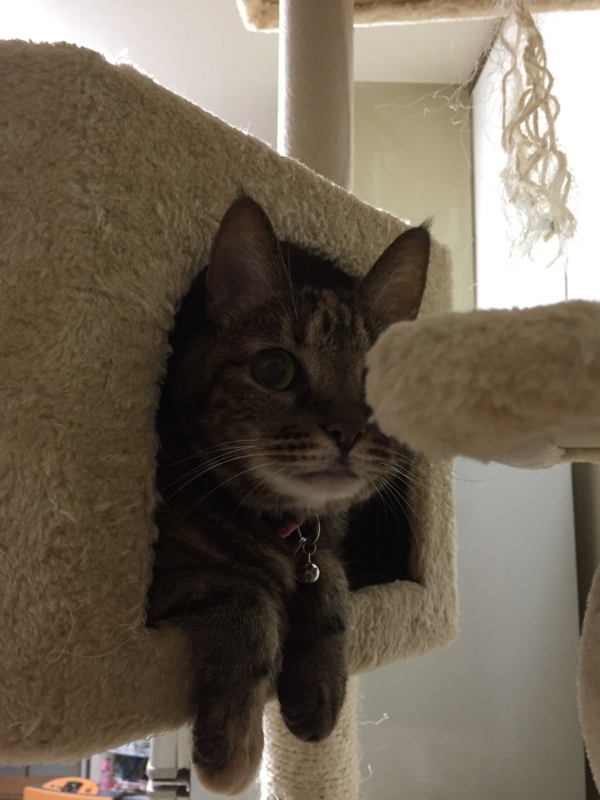 猫タワーでくつろぐエルですが、最近、あまりにもカメラ嫌いエルの可愛い写真が撮れないので、すこし前の写真です。