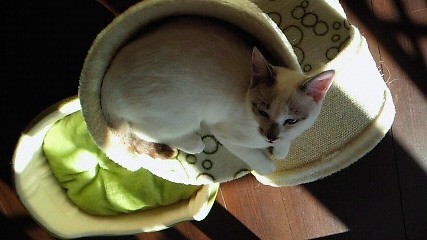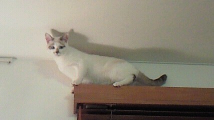 東側の小さなブラインドに乗ったら Uターン出来ずに困り顔…