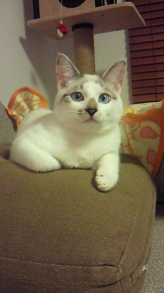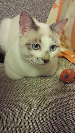コタツで寝ていてボーっとしてるので、前脚に乗せてみた。