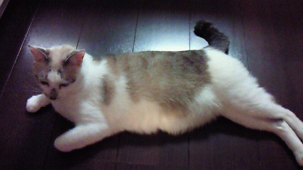 人用晩御飯を作ってるとキッチンで横になって待ってるよ。ちょっとジャマ。( ´Α`)
