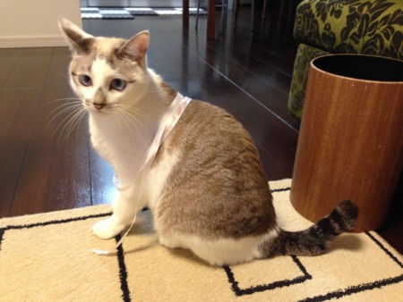 エサ皿の横に水を入れた深皿があるのだけど、その上にダンナのジャージがっ!