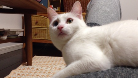 人間が すき焼でビールを飲んでいたら、図々しく膝に上がってきたよ。-_-)
