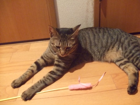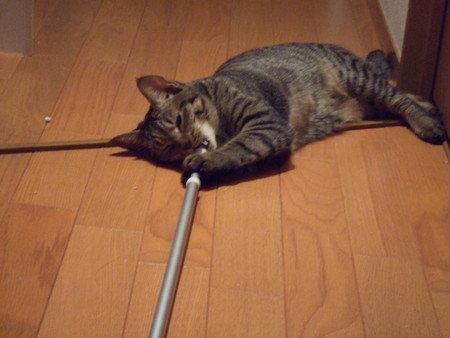 遊び疲れて眠くても、お気に入りの猫じゃらしは渡さにゃい。