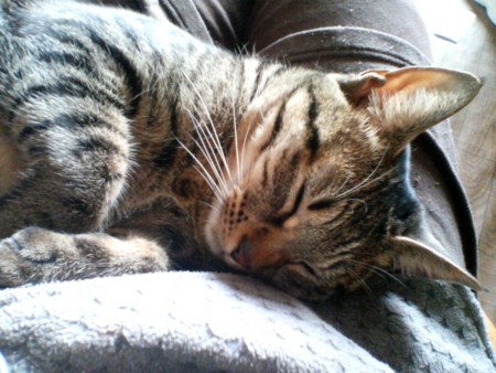 この暑さだというのに、一晩に一回は足の間に挟まって寝たがる猫(長女)。