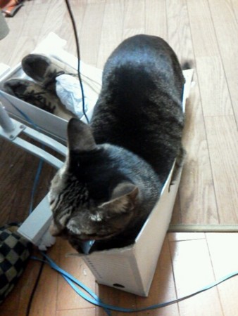 乗っている複合機は、猫にとっては座りやすい形状なのではと噂のブラザーです。