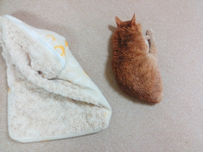 お気に入りのお座布を蹴り飛ばし子ダヌキふて寝中。