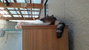古い棚の上で寝ている。