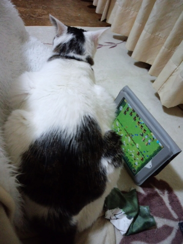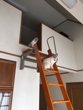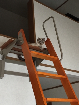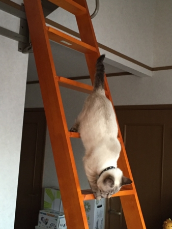運動させようと二日前からロフトに行く階段を下ろしてハシゴの上り下りの特訓の成果。