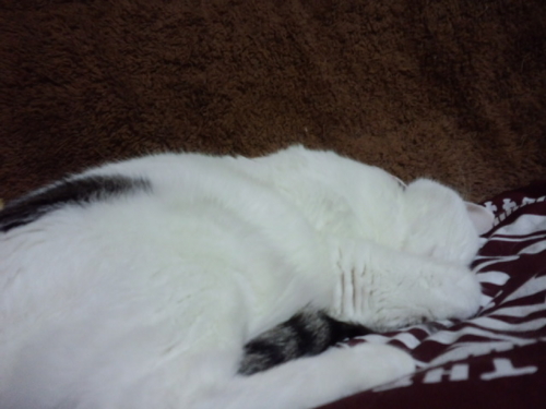 毛づくろいしながら何故か顔を隠してしまう姫様。