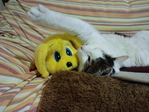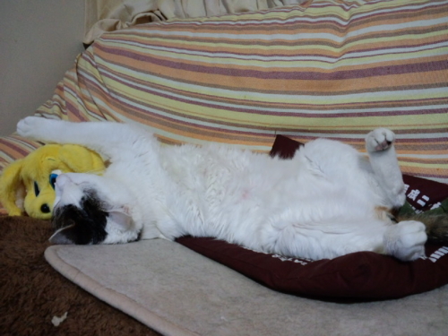 ネコ歩きに影響されたのか、廊下で普段は見向きもしないようなオモチャ(中に鈴が入ってるようなやつ)で激しく遊んでいる。