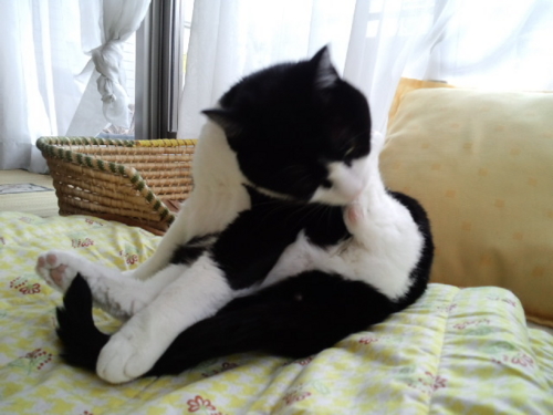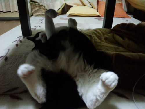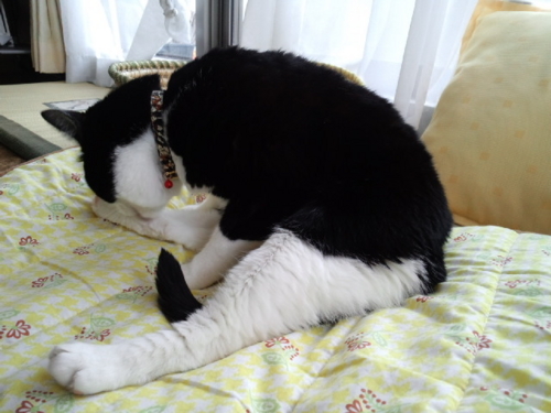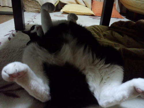 ちょっとの間、部屋を出ていて戻ってみると、うっかり置きっ放しにしていたカーディガンをうまい具合に敷物にして得意そう。