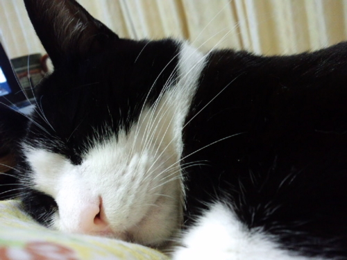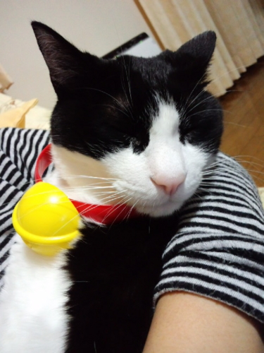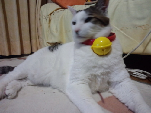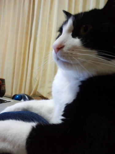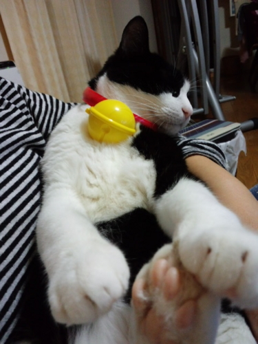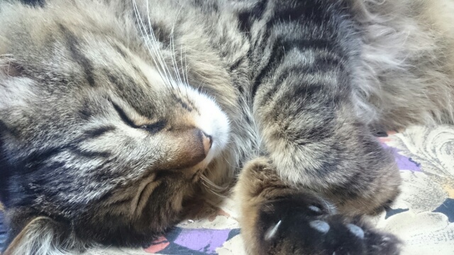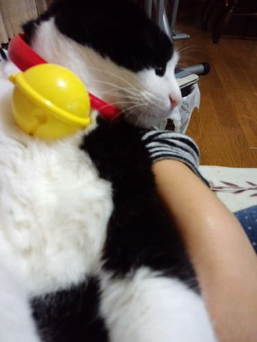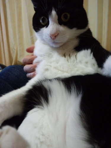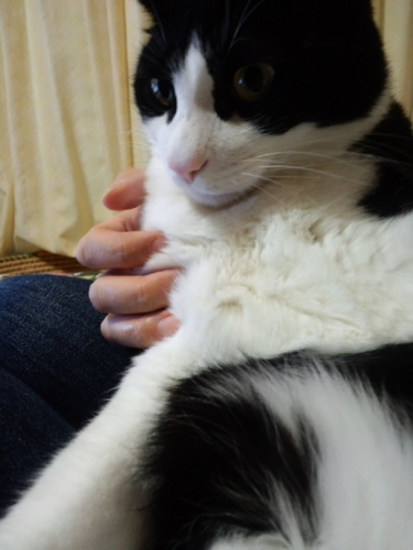 私がトイレに入っていると例によってドアの前にやってきてみゃーみゃー呼び鳴き、出てくると足元にまとわりついて離れないので、抱き上げて部屋に連れてきて、この機会にと昨日やり残した爪切りを。ついでに足の方も片方はできた。