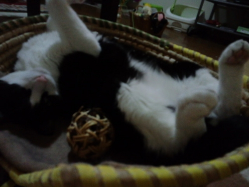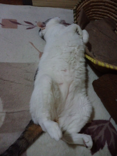うちの猫は完全にヘソ天にはならず、こんな感じが多いです。