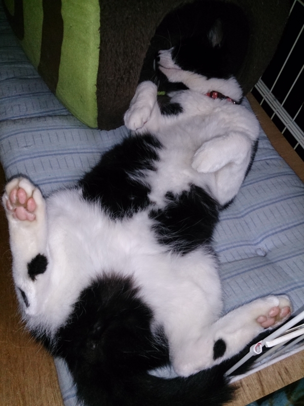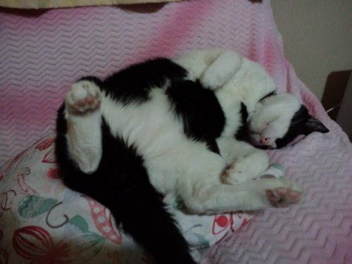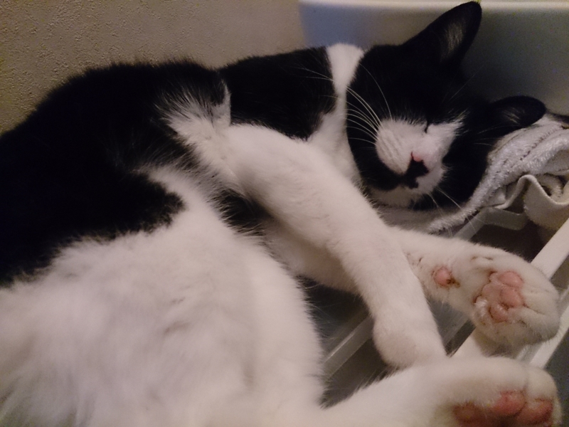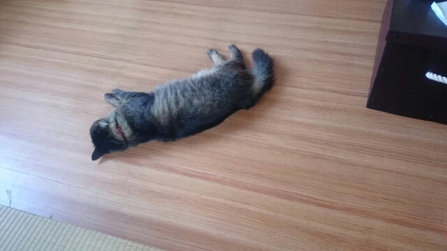 みい太は朝からずーっと寝たまま。部屋の中はそんなに暑くも寒くもなく快適だからか、時々イビキをかいたり伸びをしたりしながら、気持ちよさそうに寝てた。寝ている横の窓のカーテンを閉めた時に一瞬起きたけど、またすぐに寝る体勢に入ったので、私は黙って家を出てきたよ。