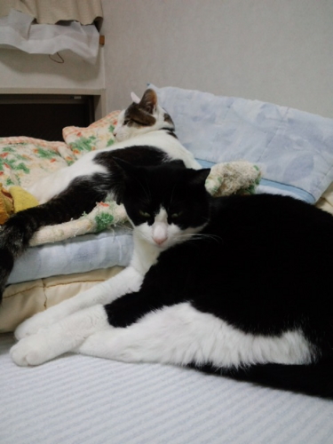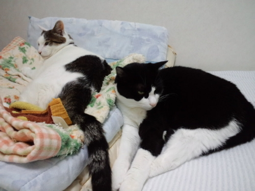 2匹で可愛く寝てるので声をかけたら起きて目を開けたけどまた寝ました。