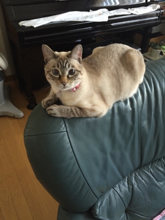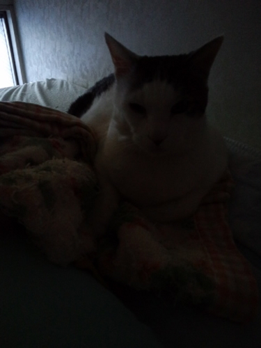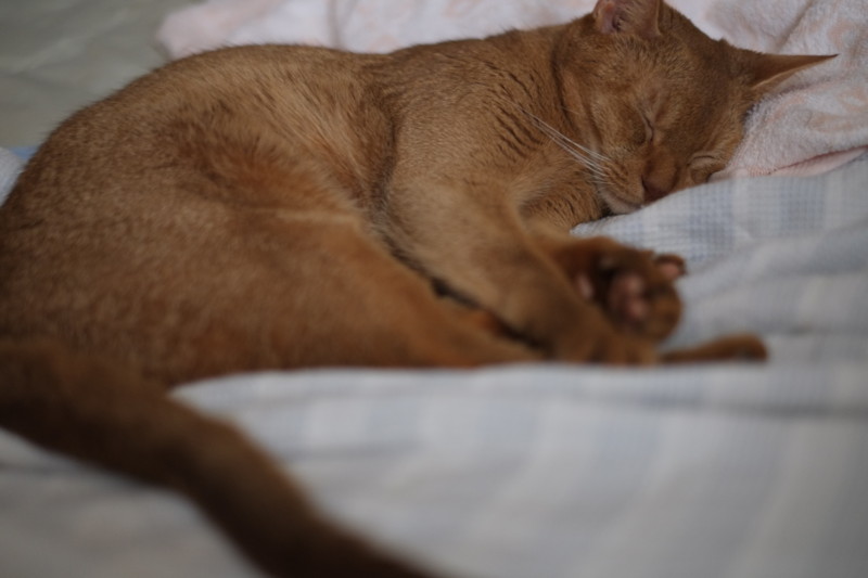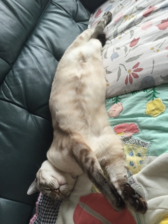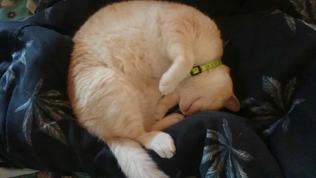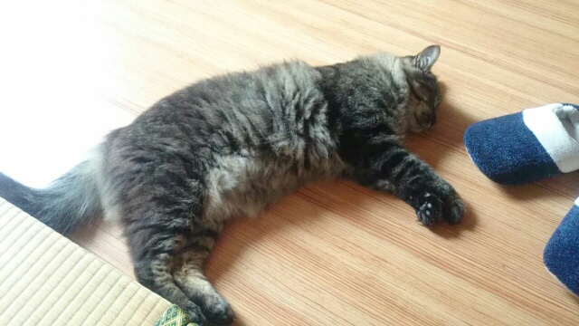 やっぱり涼しいらしく、今日はいつもの「どてーっ」じゃなくて「きゅっ」となって寝てる。