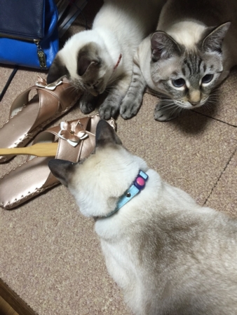 私のスリッパに孫の手を使い猫3ズをおびき寄せるの図。