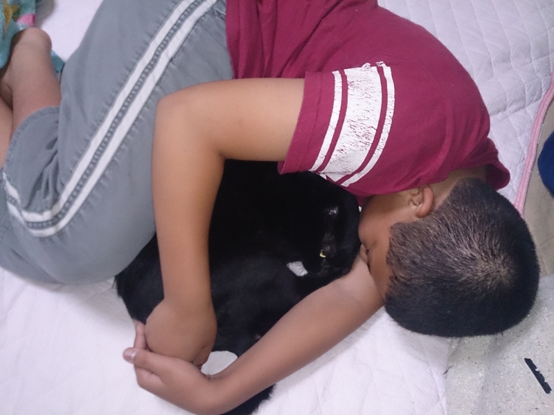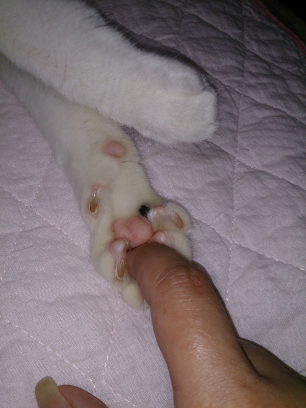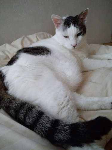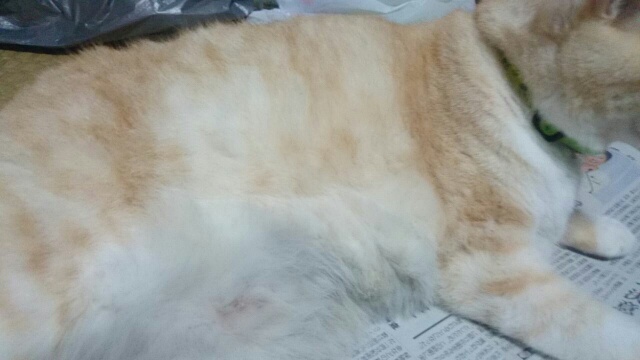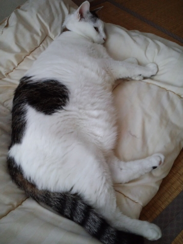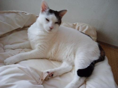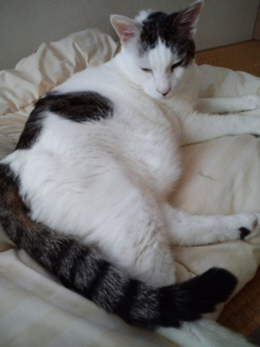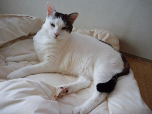 さっき帰ってきたときに一度起きてきて、ニャンニャンくっつき回ったりゴハンを食べたりしていたけれど、今はまたお布団の上で寝ている。すっかりあそこが気に入ったのか。