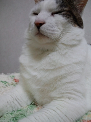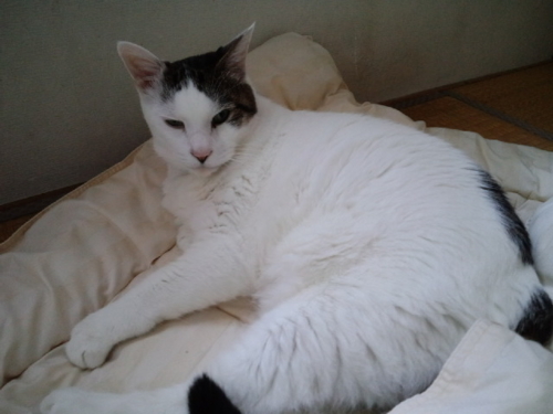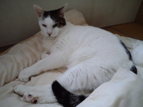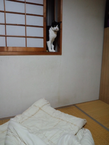 そう言えば、どうしても天袋に上がりたがって仕方がないので、だいぶ前にここに入っていた父の服の箱などを捨てて猫の遊び場として開放してやった時に、古い毛布を敷いて寝られるようにもしておいたんだった。