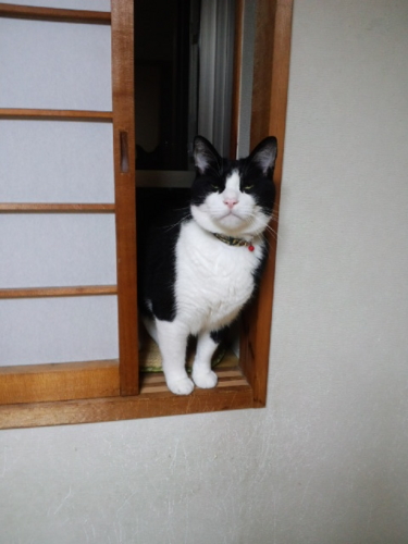 なんか上の方から猫の寝息みたいなのが聞こえるので脚立に上って見てみると、天袋の中でくつろいでいる猫。